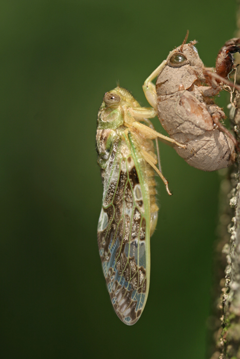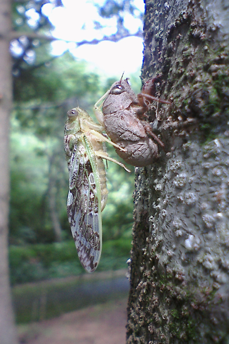 | 2005年7月24日 秋田市 小さくて可愛いセミ。ニイニイゼミの抜け殻は独特で泥だらけである。 Canon EOS 10D EF100mm f2.8 macro 1/90 f2.8 ISO100 |